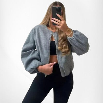 Wool Drift is your go-to cropped bomber jacket for crisp autumn strolls and cozy winter days. Designed with soft faux wool, a zip-up front, and a flattering cropped silhouette, it blends utility with warmth and style in versatile gray and beige tones.